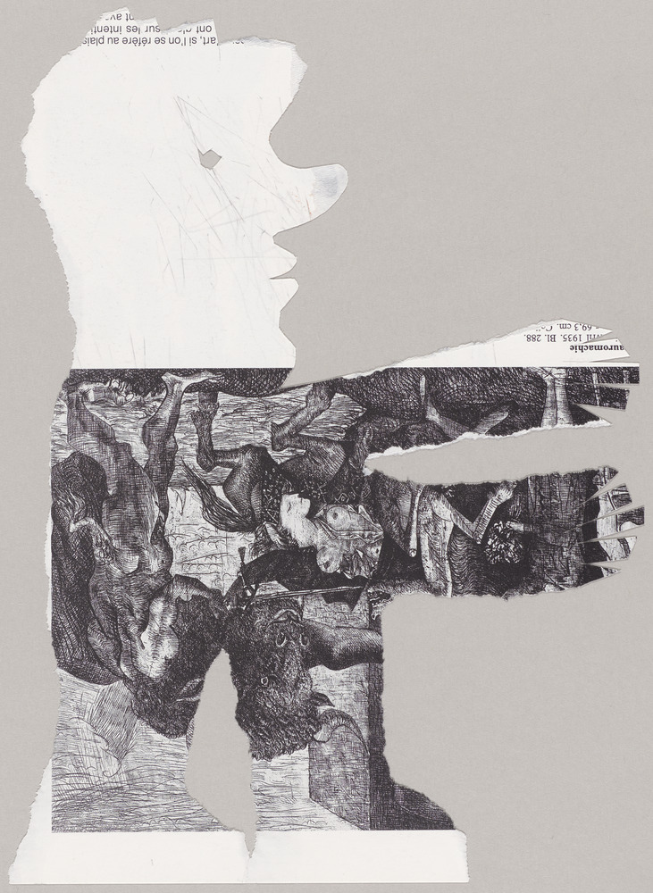 Papier faisant partie d'un ensemble de découpages et de déchirures réalisés à partir de photocopies de textes et de dessins de Pablo Picasso et mis en transparence sur papier photographique pour illustrer le "Désir attrapé par la queue", commande du professeur Jean Amiel