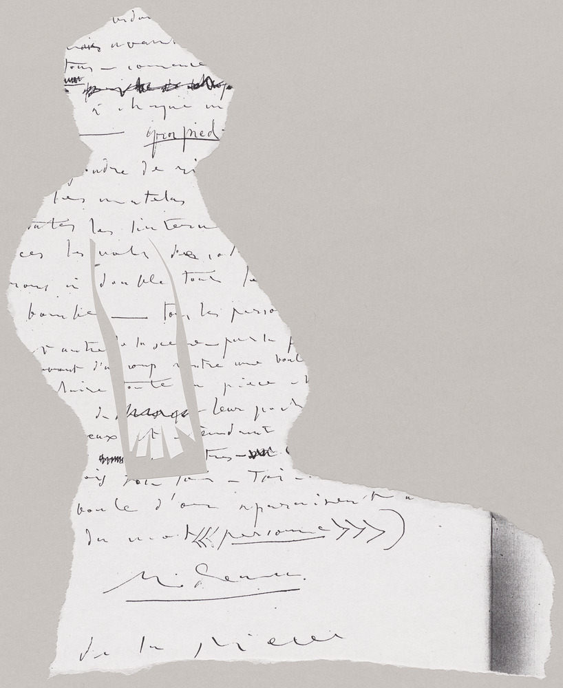 Papier faisant partie d'un ensemble de découpages et de déchirures réalisés à partir de photocopies de textes et de dessins de Pablo Picasso et mis en transparence sur papier photographique pour illustrer le "Désir attrapé par la queue", commande du professeur Jean Amiel