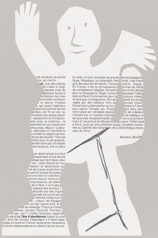 Papier faisant partie d'un ensemble de découpages et de déchirures réalisés à partir de photocopies de textes et de dessins de Pablo Picasso et mis en transparence sur papier photographique pour illustrer le "Désir attrapé par la queue", commande du professeur Jean Amiel