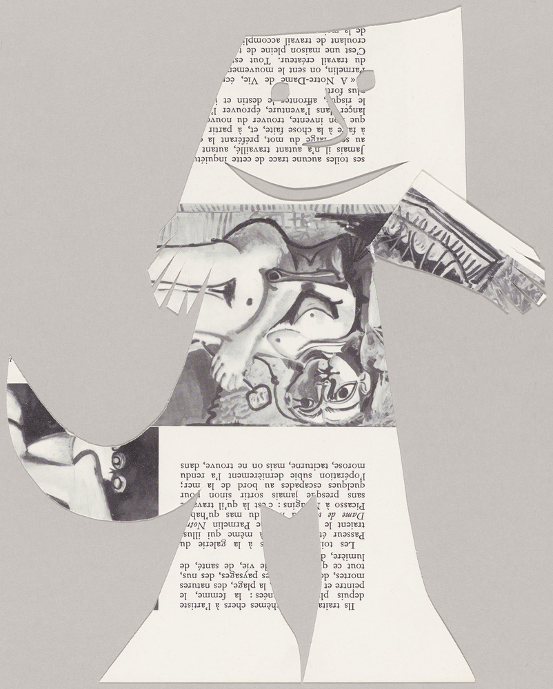 Papier faisant partie d'un ensemble de découpages et de déchirures réalisés à partir de photocopies de textes et de dessins de Pablo Picasso et mis en transparence sur papier photographique pour illustrer le "Désir attrapé par la queue", commande du professeur Jean Amiel