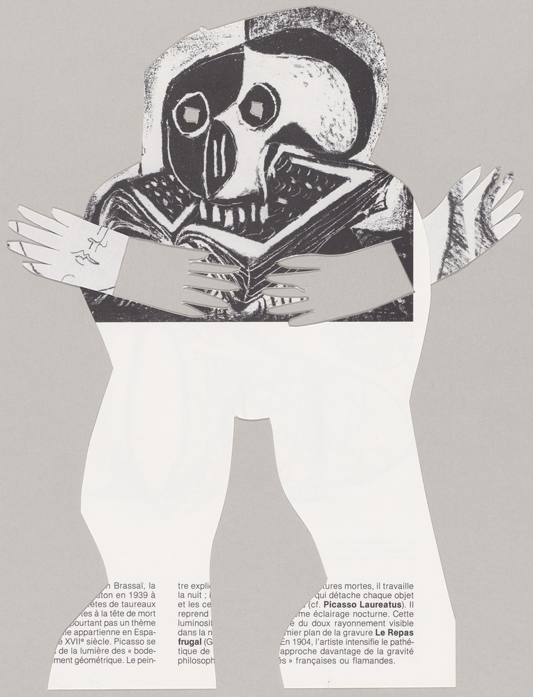 Papier faisant partie d'un ensemble de découpages et de déchirures réalisés à partir de photocopies de textes et de dessins de Pablo Picasso et mis en transparence sur papier photographique pour illustrer le "Désir attrapé par la queue", commande du professeur Jean Amiel