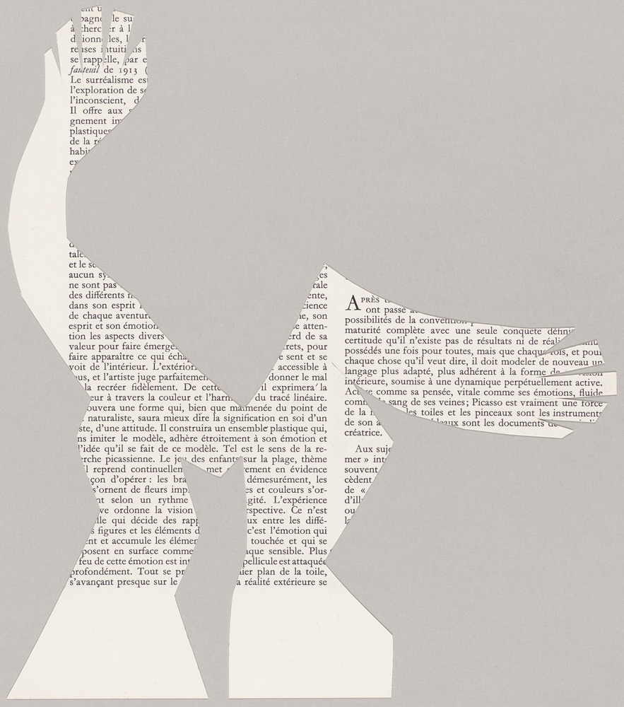 Papier faisant partie d'un ensemble de découpages et de déchirures réalisés à partir de photocopies de textes et de dessins de Pablo Picasso et mis en transparence sur papier photographique pour illustrer le "Désir attrapé par la queue", commande du professeur Jean Amiel