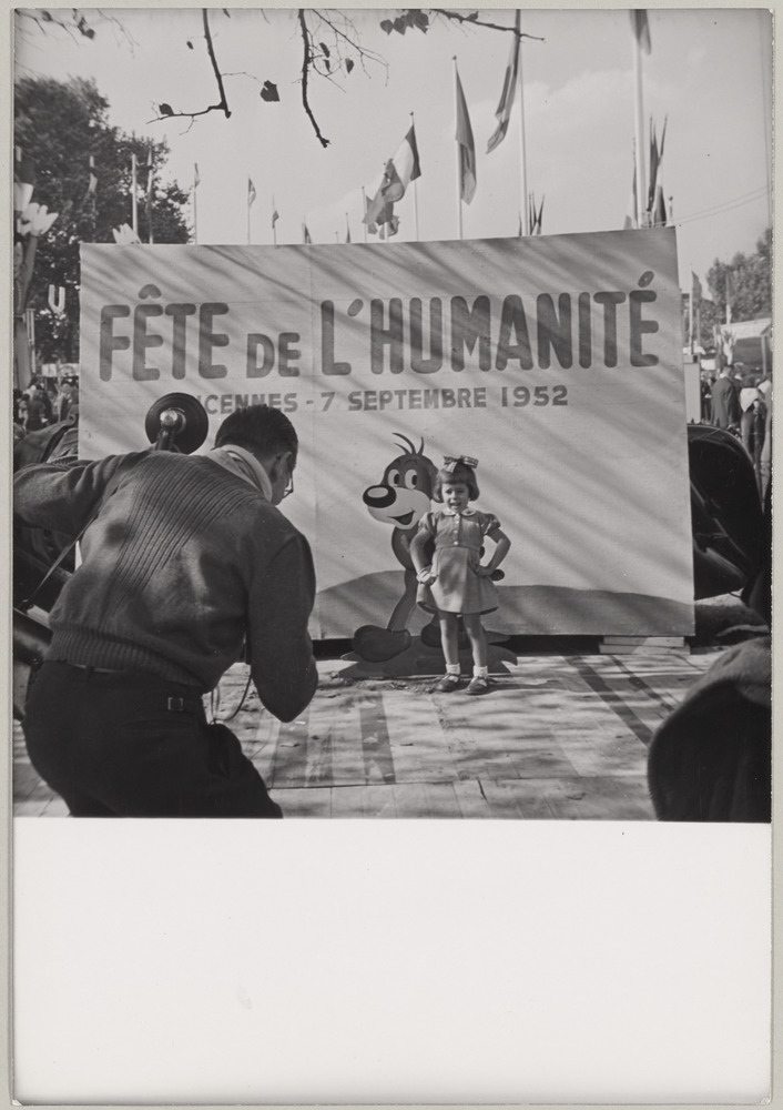 Fillette posant devant un panneau de la Fête de l'Humanité, Bois de Vincennes, le 7 septembre 1952