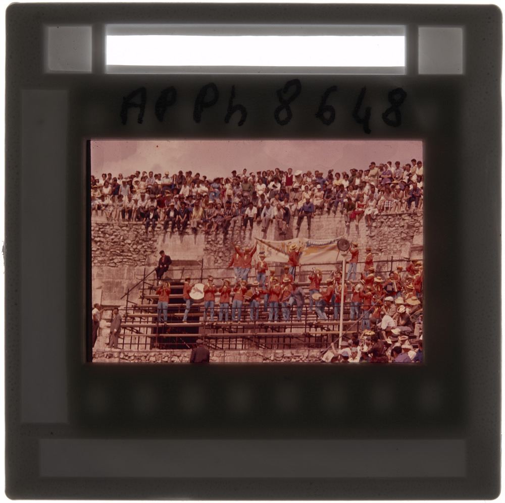 Foule avec un orchestre en tenue traditionnelle dans les gradins des arènes