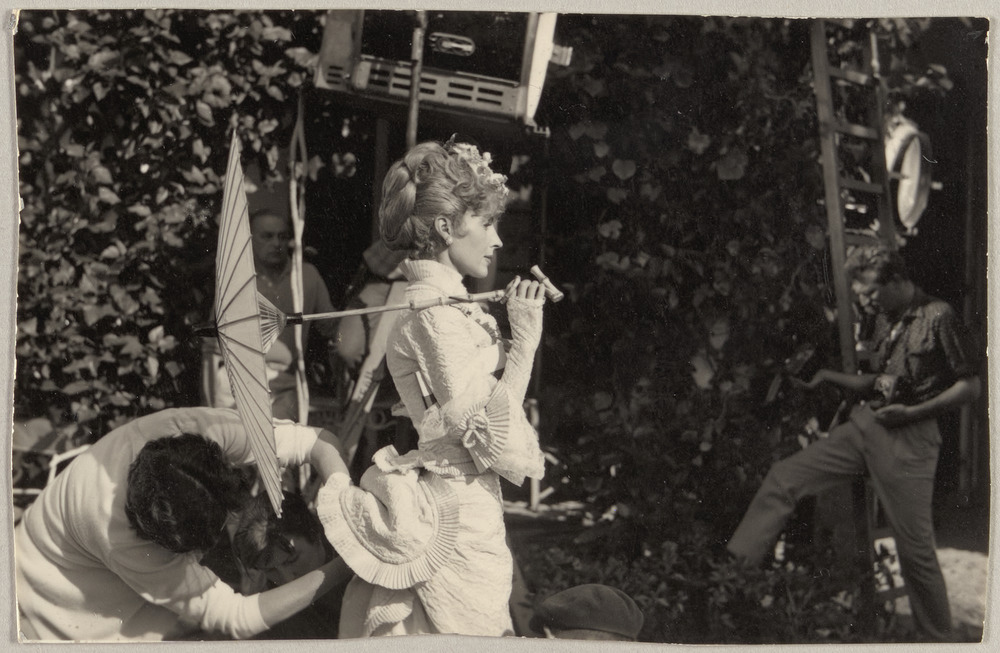 Francine Weisweiller dans le rôle de "la dame distraite" avec une habilleuse sur le tournage du "Testament d'Orphée" de Jean Cocteau, en 1959