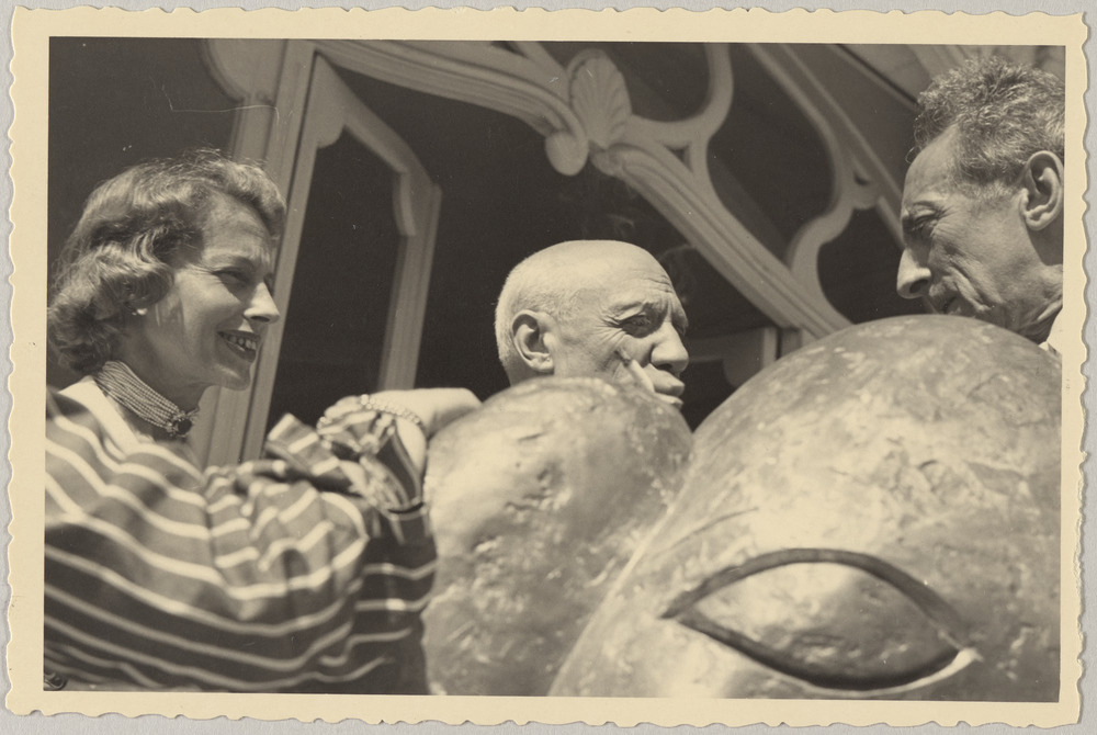 Francine Weisweiller, Pablo Picasso et Jean Cocteau derrière la sculpture en bronze "Tête de femme", sur le perron de La Californie, Cannes, en 1956