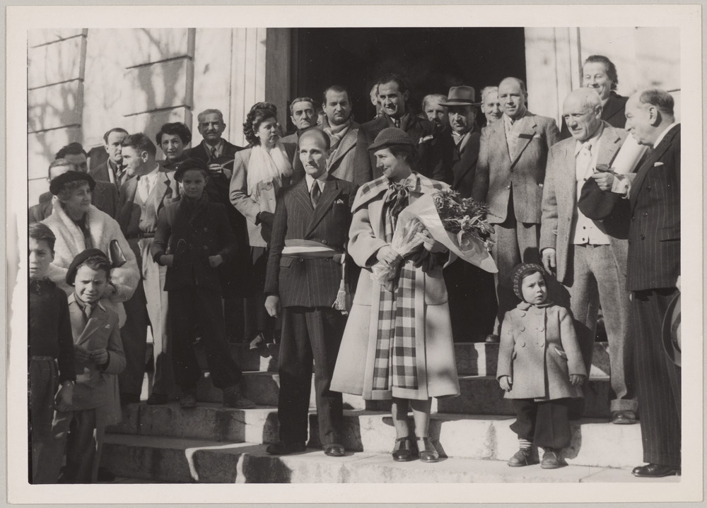Françoise Gilot avec le maire Paul Derigon, Pablo et Claude Picasso et Virgile Barel lors de la remise du diplôme de citoyen d'honneur de la ville de Vallauris, le 29 janvier 1950