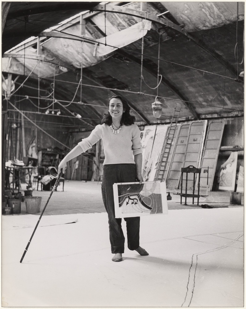 Françoise Gilot dans un hangar avec les maquettes pour le ballet "Héraclès" au sol, en 1953