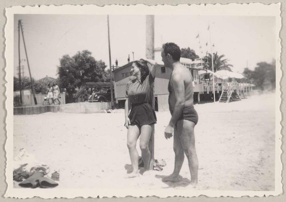 Françoise Gilot et Michel Sima sur la plage de Golfe-Juan, en 1948