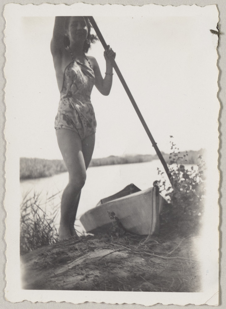 Françoise Gilot près d'une barque au bord de l'eau, en [1948]