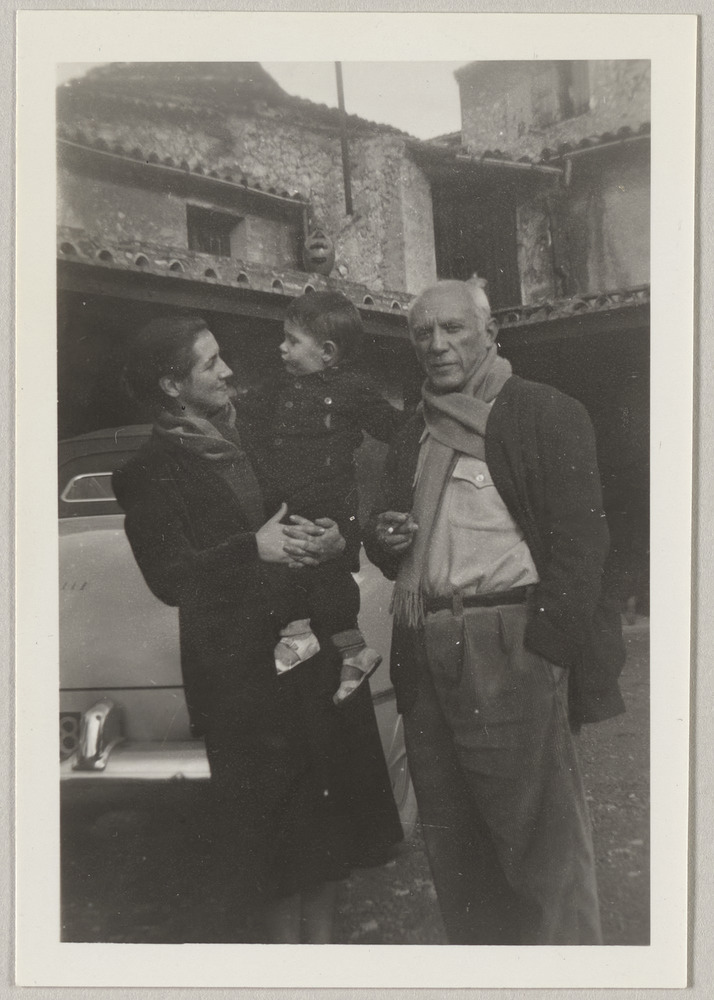 Françoise Gilot tenant Claude dans ses bras et Pablo Picasso dans la cour de l'atelier Madoura, Vallauris, en décembre 1949