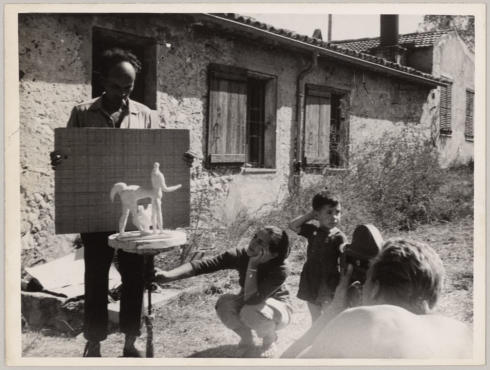Frédéric Rossif tenant une planche de fond, Françoise Gilot tenant le pied de la table, Claude Picasso à ses côtés et Jean Gonnet à la caméra filmant la figurine en terre cuite "Centaure" devant l'atelier du Fournas sur le tournage du film "La mort de Charlotte Corday", Vallauris, en 1950