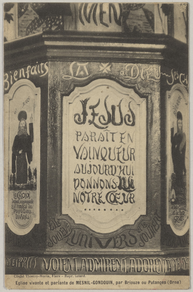 Fresques sur un des piliers de l'église Saint-Vigor, dite église vivante et parlante, de Ménil-Gondouin