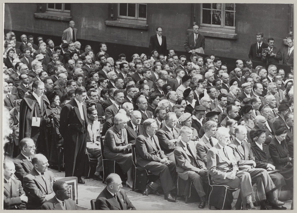 Annotation dactylographiée au dos sur un feuillet collé au dos du tirage : "Les funérailles nationales de Frédéric Joliot-Curie. Les personnalités dans la cour de la Sorbonne. U.F.P.19/8/1958."