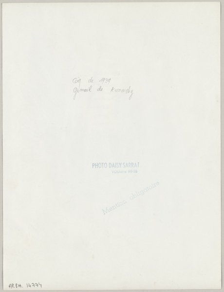 Cachet bleu, au verso, au centre : "PHOTO DAISY SARRAT / VOLtaire 98-28 / Mention obligatoire"