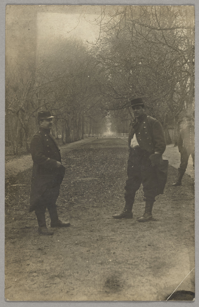 Georges Braque en soldat avec deux autres soldats dans un parc, début 1911