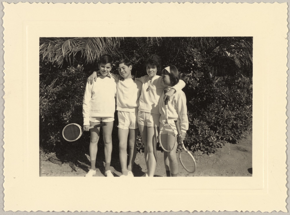 Gérard Sassier, Claude Picasso, Catherine Hutin et Paloma Picasso en tenue de tennis à [Cannes], fin des années 1950