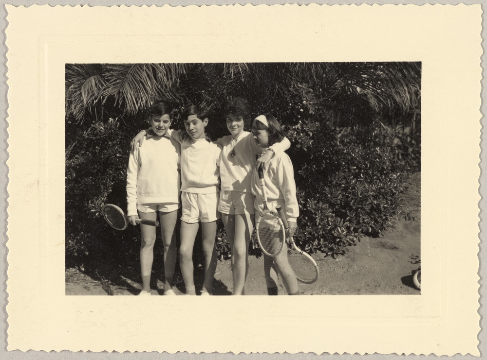 Gérard Sassier, Claude Picasso, Catherine Hutin et Paloma Picasso en tenue de tennis à [Cannes], fin des années 1950