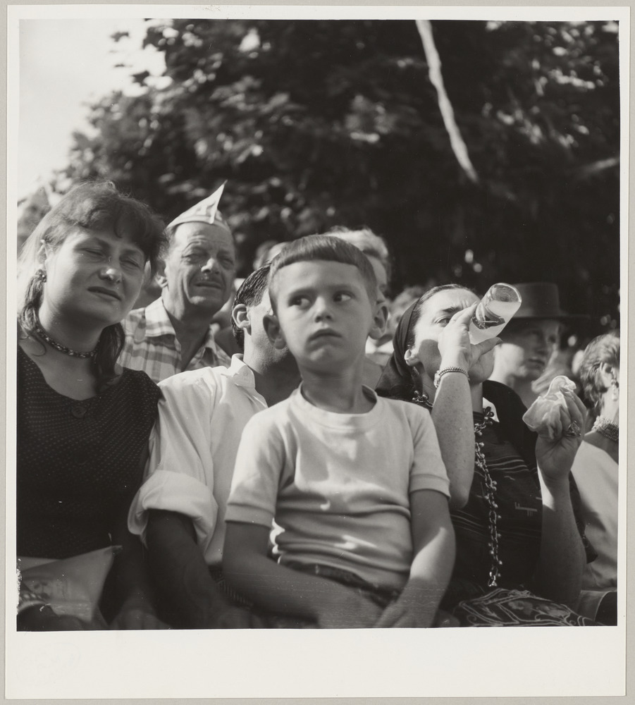 Germaine Lascaux avec Javier Vilató Ruiz, leur fils Xavier et Jacqueline Roque dans les tribunes, lors de la corrida de Vallauris, en août 1956