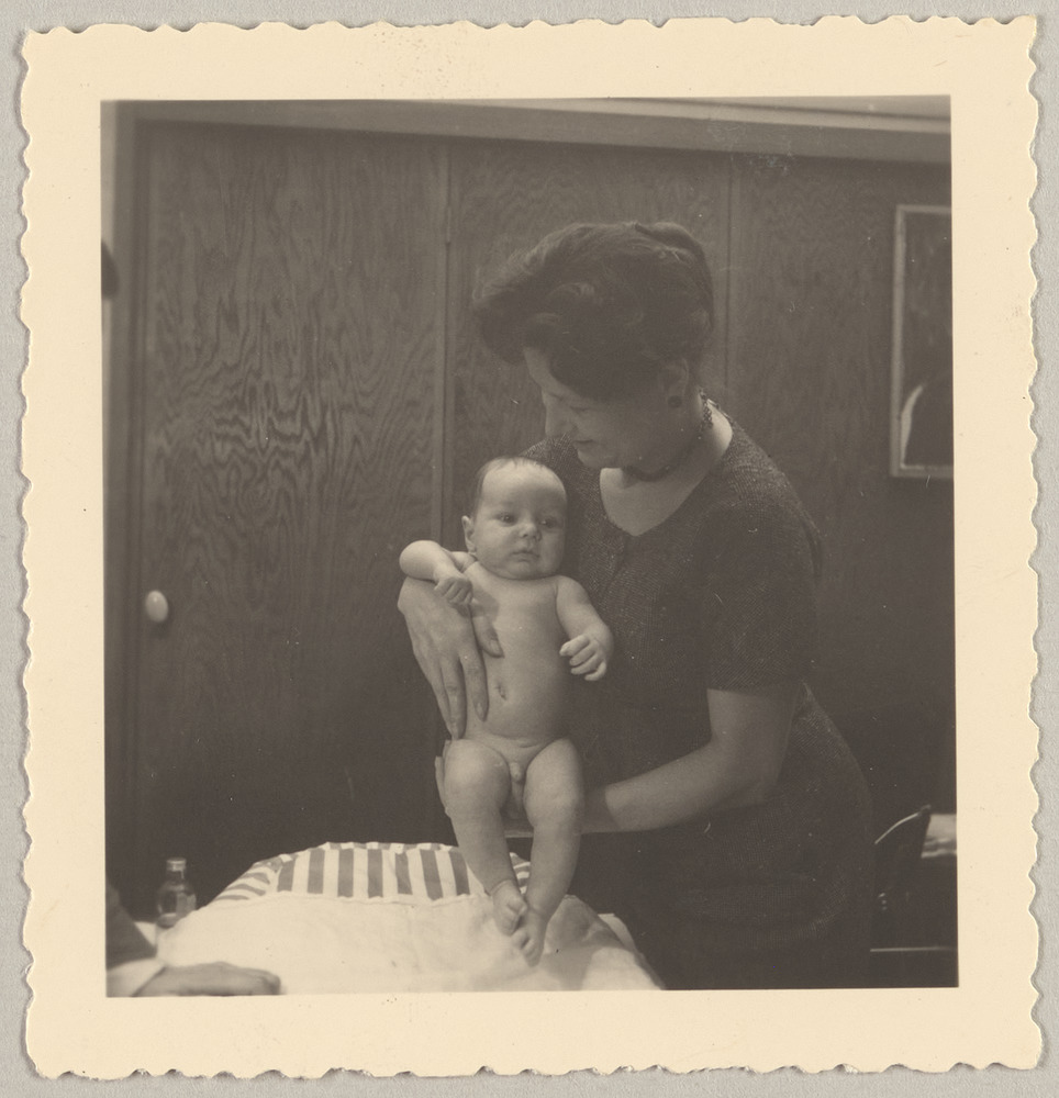 Germaine Lascaux et son fils Xavier Vilató Ruiz sur la table à langer, en 1958