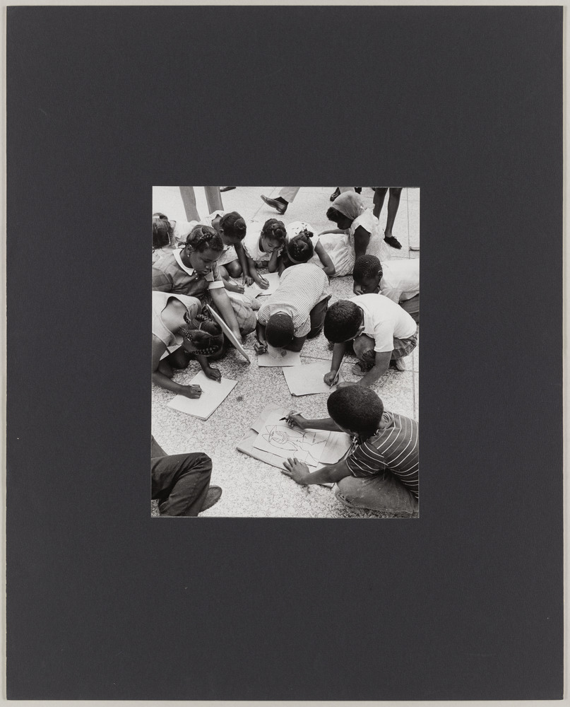 Groupe d'enfants reproduisant la sculpture monumentale "Tête" du Chicago Civic Center (Daley Center), Chicago, en août 1967