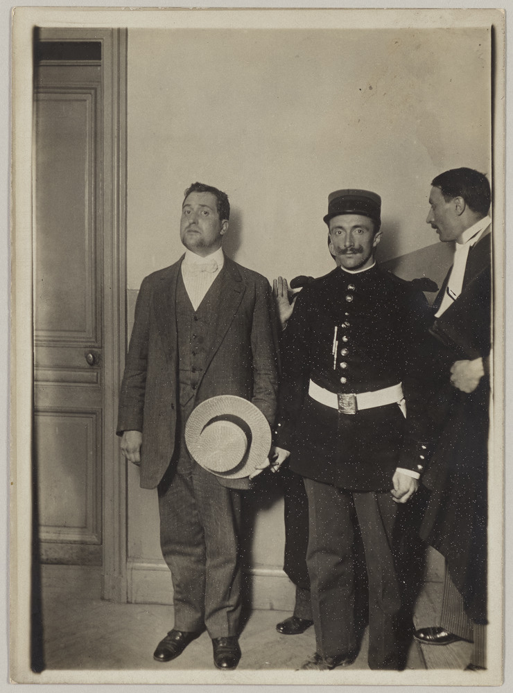 Annotation manuscrite au dos, centrée en haut : "L'Affaire de la Joconde - M. Apollinaire, l'Ecrivain très connu inculpé dans l'affaire de la Joconde et les recels des vols du Musée. Dans les Couloirs de l'instruction à sa sortie du Cabinet de M. Drioux qui instruit l'affaire. A sa droite Me José Théry, un de ses avocats"