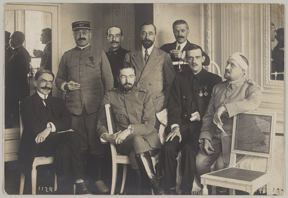 Guillaume Apollinaire à la tête bandée avec le médecin-chef Palazzoli, le lieutenant Bachés, Serge Férat et des officiers à l'Hôpital militaire italien, Quai d'Orsay, Paris, en 1916