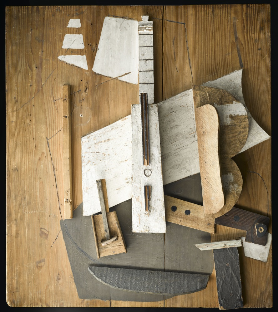 Éléments de sapin partiellement peints, papier collé, traits au fusain, clous, sur fond de bois