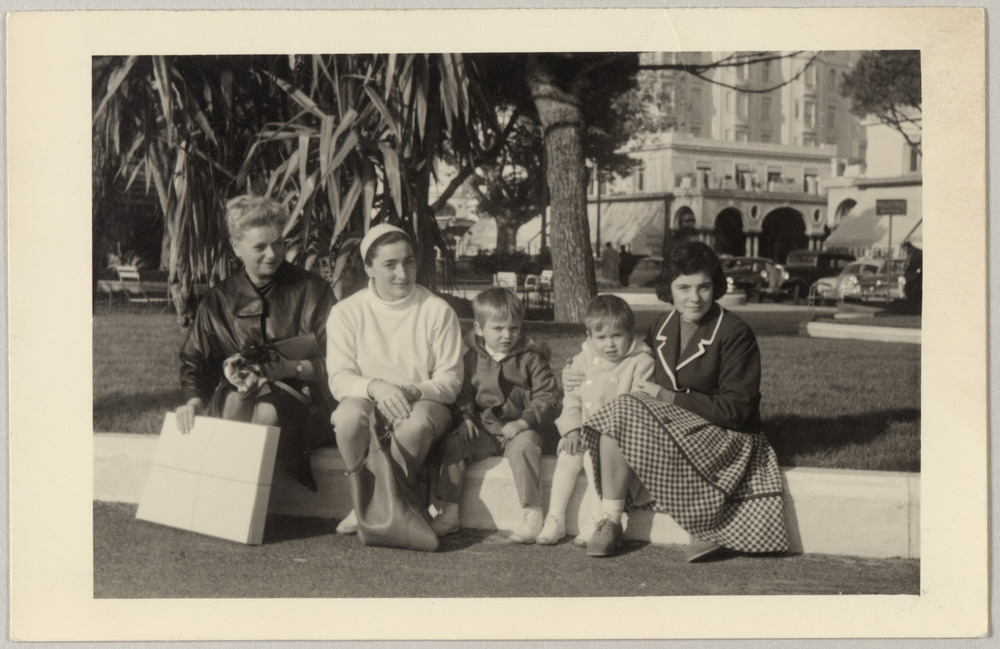 Hélène Parmelin, Jacqueline Roque, Catherine Hutin et les enfants Miguel et Lucia Dominguin à Cannes, en 1959