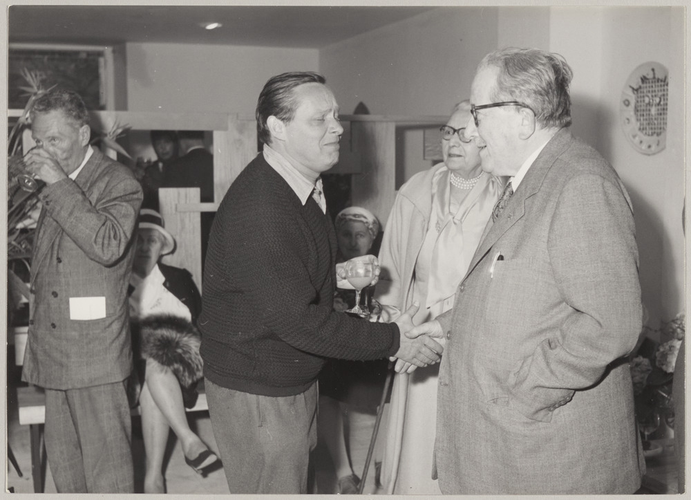 Henri Laugier, Marie Cuttoli et deux hommes lors de l'inauguration de la galerie Madoura, Cannes, début 1961