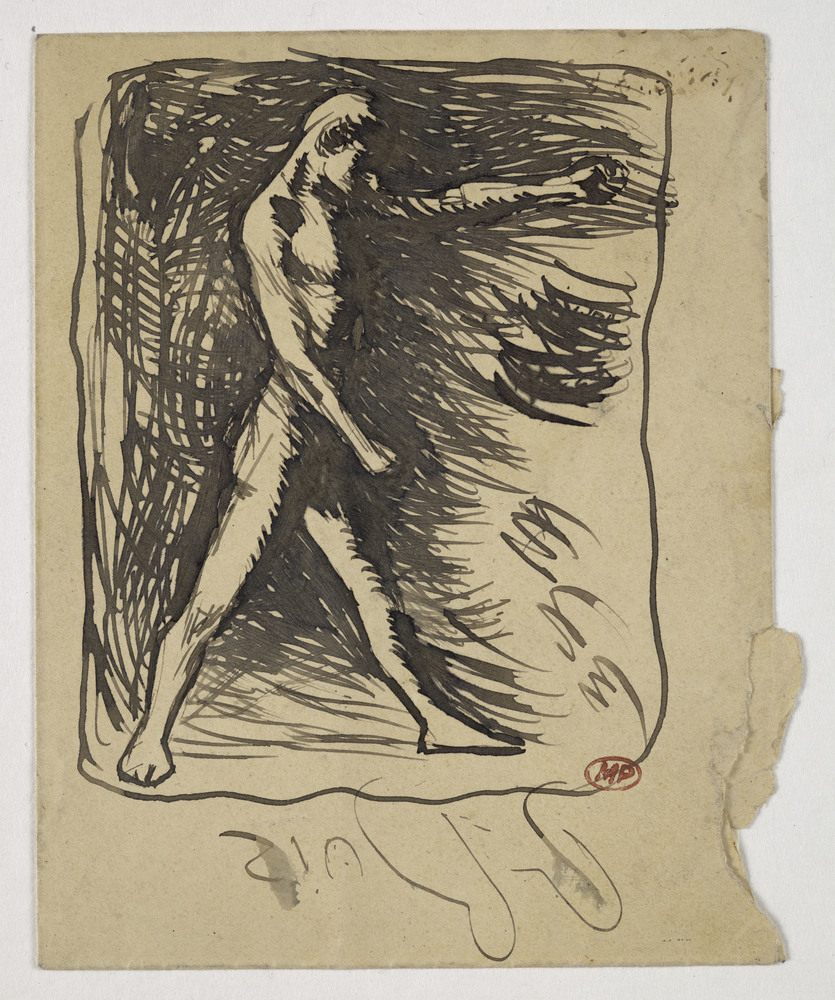 Ce nu masculin à la gestuelle digne d’une académie frappe par son attitude volontaire et la force psychologique qui s’en dégage. L’homme dressé sur ses deux jambes, le bras tendu, a des allures d’acteur tragique. Le trait agité rappelle ici les lignes des artistes symbolistes, comme Aubrey Beardsley, tandis que le cerne noir évoque les oeuvres graphiques d’illustrateurs de presse, comme ceux de La Revue blanche à laquelle collaboraient Toulouse-Lautrec et les nabis. Le cadre noir tracé autour de la composition est d’ailleurs emprunté à la technique de l’affiche et à celle des cartouches de frontispices. Picasso y a recours dans plusieurs dessins réalisés au tournant du siècle (MP439) conjointement à ses projets d’affiches (MP427) ou ses dessins de presse. Enfin, l’étrange posture de ce nu qui présente un intéressant raccourci au niveau de la jambe droite, est également prétexte à un travail sur les modelés, traités en réserve sur un fond noirci. La figure rappelle d’ailleurs celle de L’Homme qui marche d’Auguste Rodin dont le plâtre, exposé dans le pavillon consacré au sculpteur lors de l’Exposition universelle de 1900, a pu être vu par Picasso lors de son arrivée à Paris.