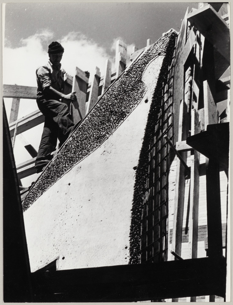 Homme travaillant sur le côté gauche de la sculpture "Femme aux bras écartés", parc du prieuré de Saint-Hilaire, Chalo-Saint-Mars, en 1962