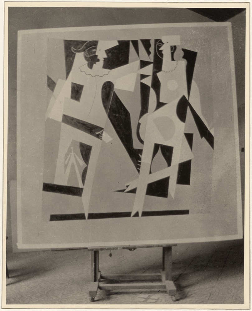 Huile sur toile "Arlequin et femme au collier" de 1917 sur un chevalet, dans l'atelier de la Via Margutta, à Rome, en 1917