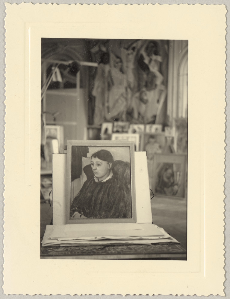 Huile sur toile du portrait de "Madame Cézanne en robe rayée" de 1883-85, posée sur un carton à dessin, avec les "Demoiselles d'Avignon" en arrière-plan à La Californie