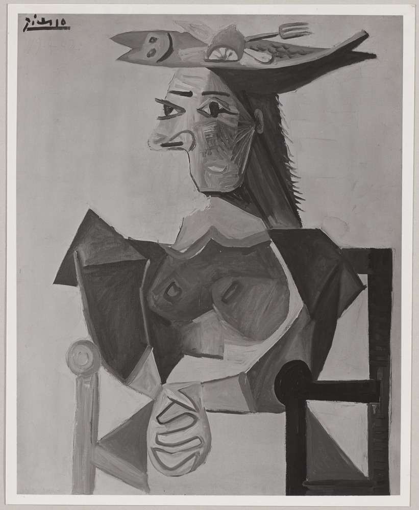 Copié dans le presse-papier :Huile sur toile "Femme assise au chapeau en forme de poisson", 19 avril 1942 - s.d. - https://cep.museepicassoparis.fr/explorer/huile-sur-toile-femme-assise-au-chapeau-en-forme-de-poisson-19-avril-1942-apph12082