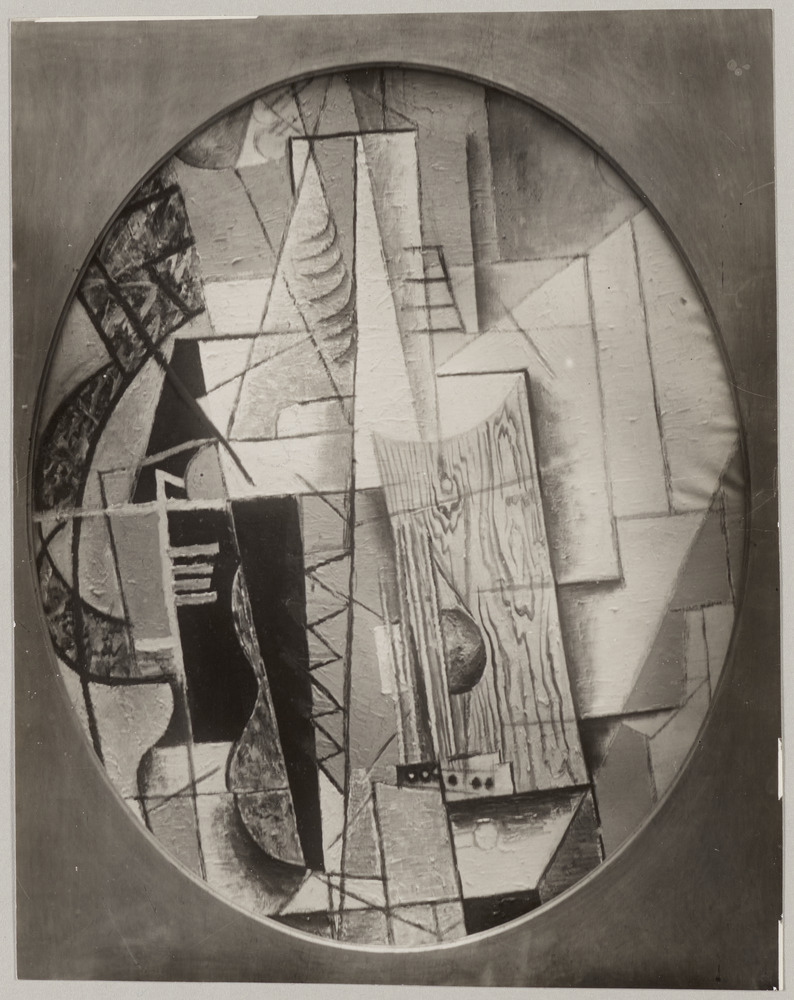 Inscription manuscrite au crayon, au verso, à gauche au milieu : "Z II 1, 357 / Guitare / sorgues, été 1912 / huile sur toile ovale / 0,725 x 0,600 / Coll. Oslo Nasjonal galleriet"