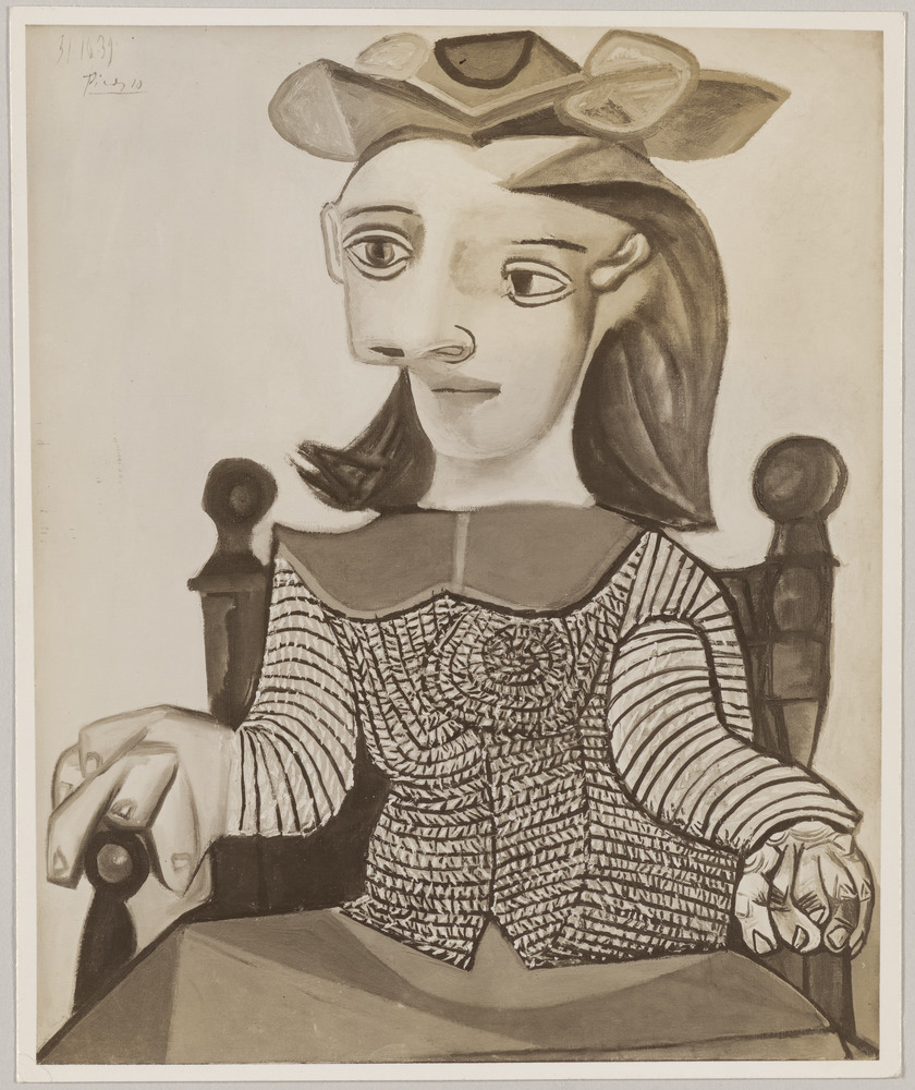 Feuillet tapuscrit contrecollé au dos du tirage, en haut à gauche : "Paul Rosenberg & Co. PICASSO 4229 "Femme assise Robe jaune" 1939 32 x 25 1/2"