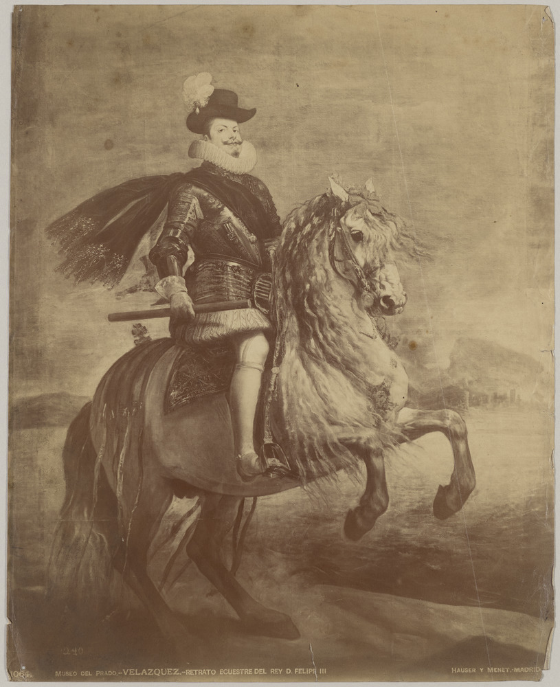 Annotation tapuscrite au recto, en bas à gauche : "1064. Museo Del Prado - VELASQUEZ - RETRATO ECUESTRE DEL REY D. FELIPE III"