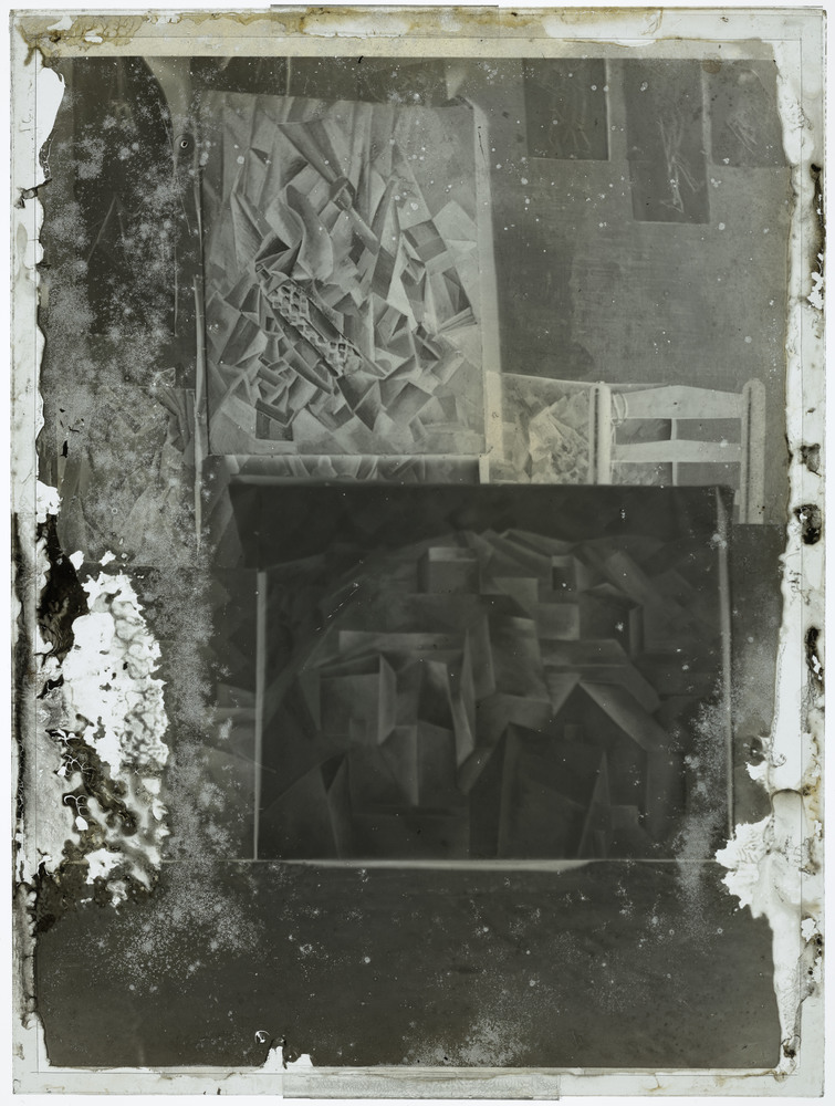 Huiles sur toile "Bouteille d'Anis Del Mono", "Le réservoir, Horta", "L'usine de Horta de Ebro", "Maisons sur la colline" et des dessins préparatoires de "Nu debout aux bras levés" accrochés au mur, dans l'atelier de Horta de Sant Joan, Espagne en été 1909