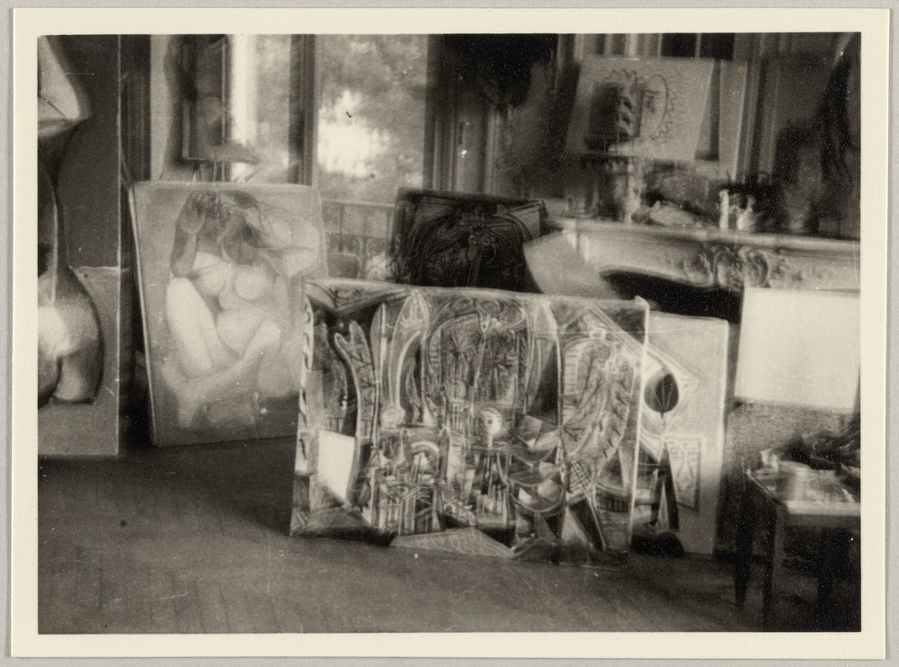 Huiles sur toile "L'atelier" et "Femme nue accroupie" avec d'autres oeuvres dans l'atelier de La Californie, Cannes, vers [1956-61]