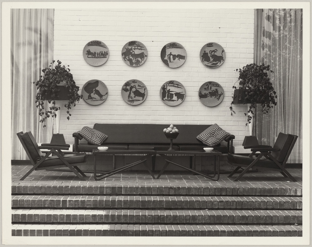 Huit assiettes des corridas de Picasso sur la terrasse chez les [Brady], Beverly Hills, Californie