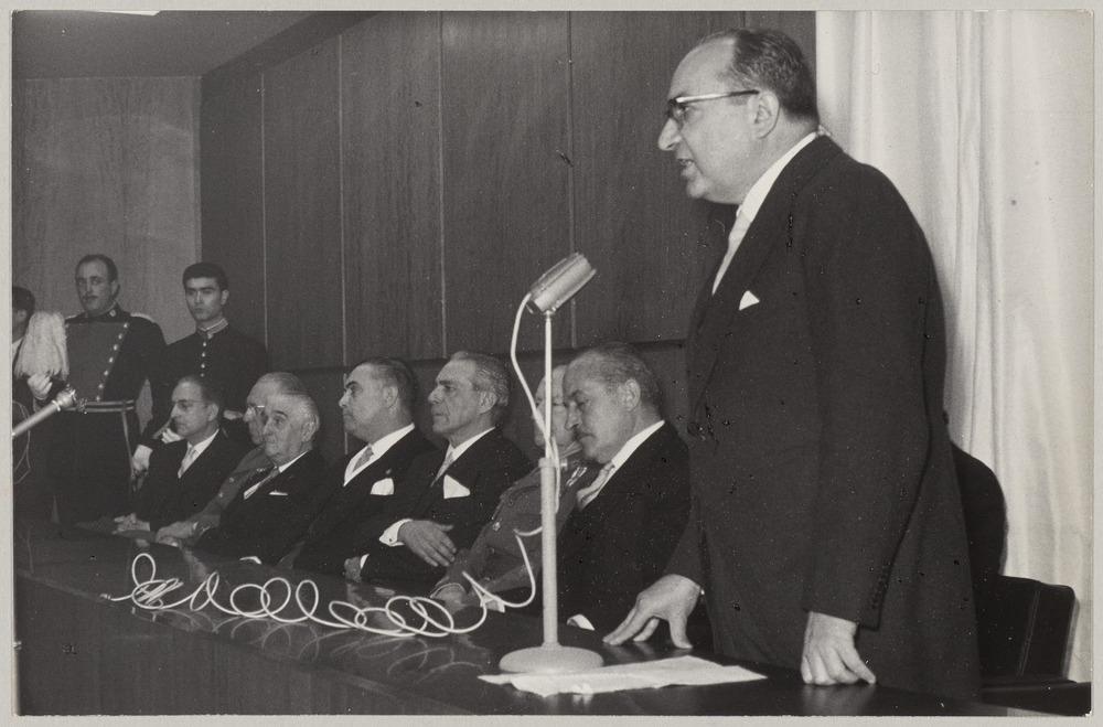 L'homme au micro est l'architecte Manuel de Solà-Morales de Rosellò (1910-2003), secrétaire du Collège d'architectes de Catalogne en 1945, puis doyen de 1954 à 1964. C'est sous son impulsion qu'est organisé le concours d'architecture pour le nouveau siège du Collège sur la plazza Nueva.