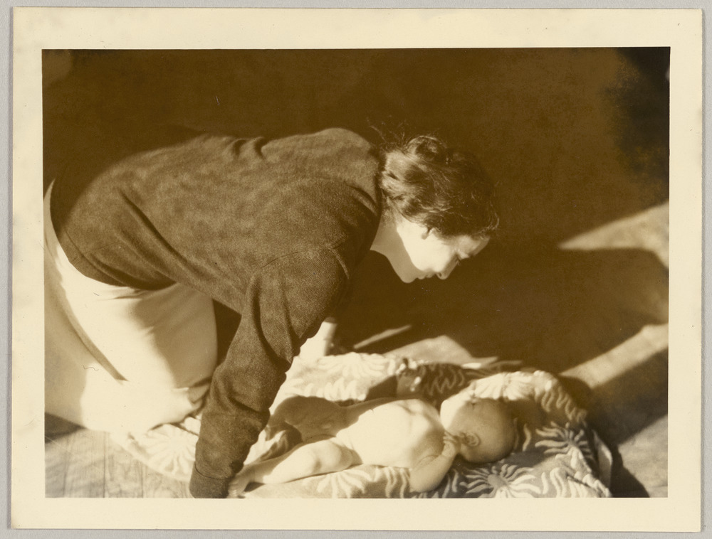 Jacqueline Roque observant Bernard Picasso bébé allongé au sol à La Californie, Cannes, en [1959]