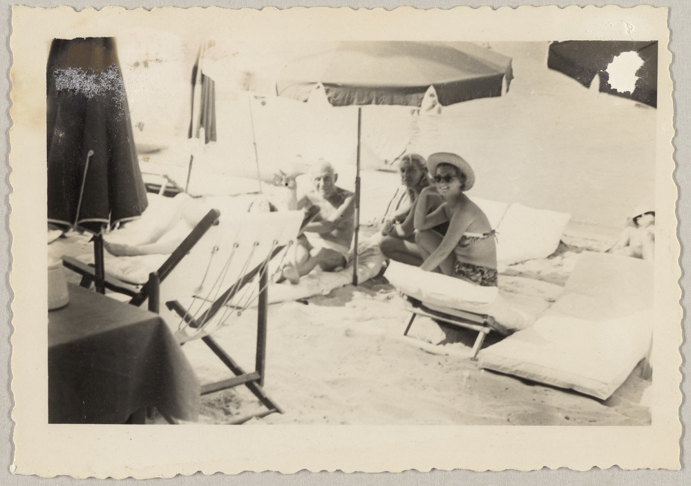 Jacqueline Roque, Pablo Picasso, Maya et Madame Choquet à la plage de la Garoupe, Cap d'Antibes, circa 1960
