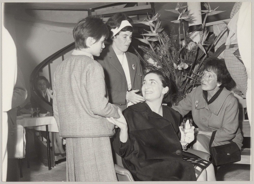 Jacqueline Roque, Paloma Picasso, Catherine Hutin et Yvonne Vallée lors de l'inauguration de la galerie Madoura, Cannes, début 1961