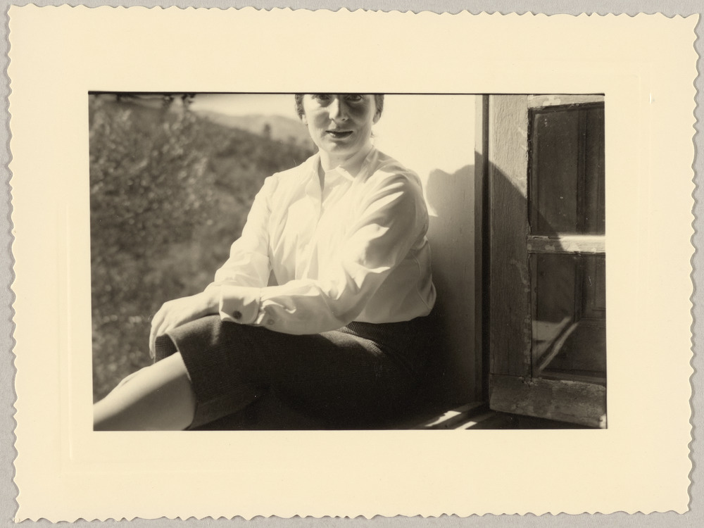Jacqueline Roque sur le rebord d'une fenêtre au château de Vauvenargues