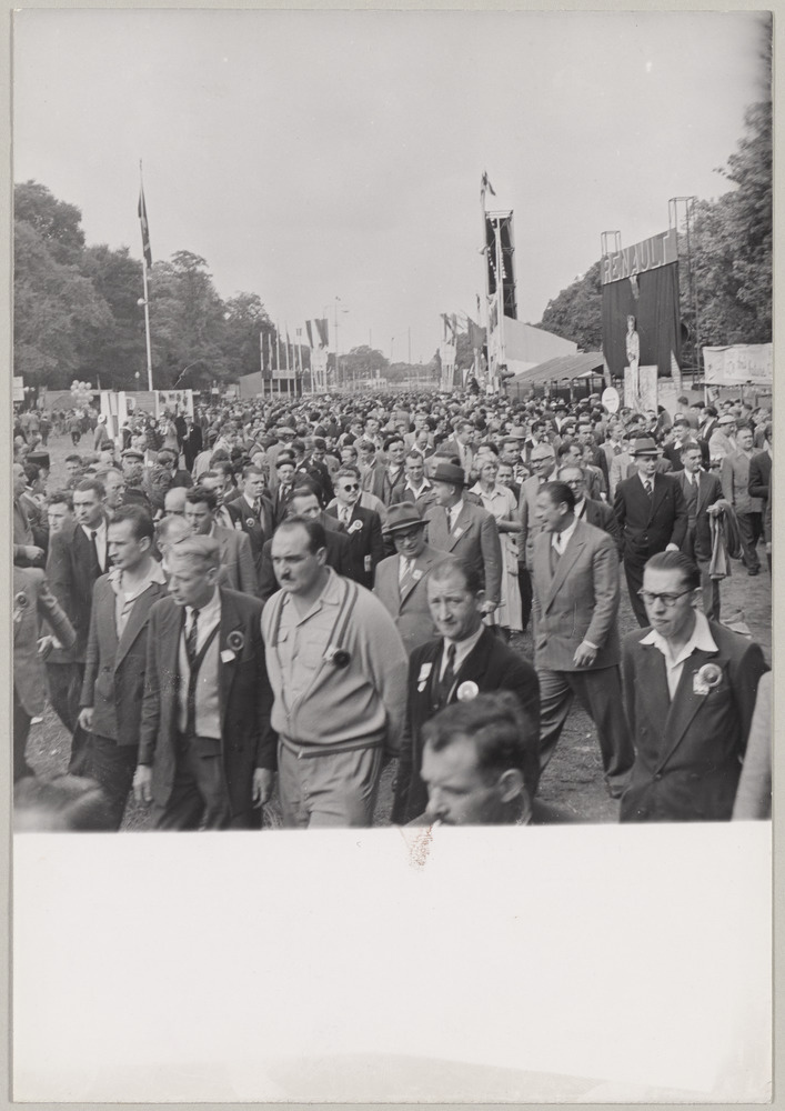Jacques Duclos et des représentants du Parti communiste français à la Fête de l'Humanité, Bois de Vincennes, le 7 septembre 1952