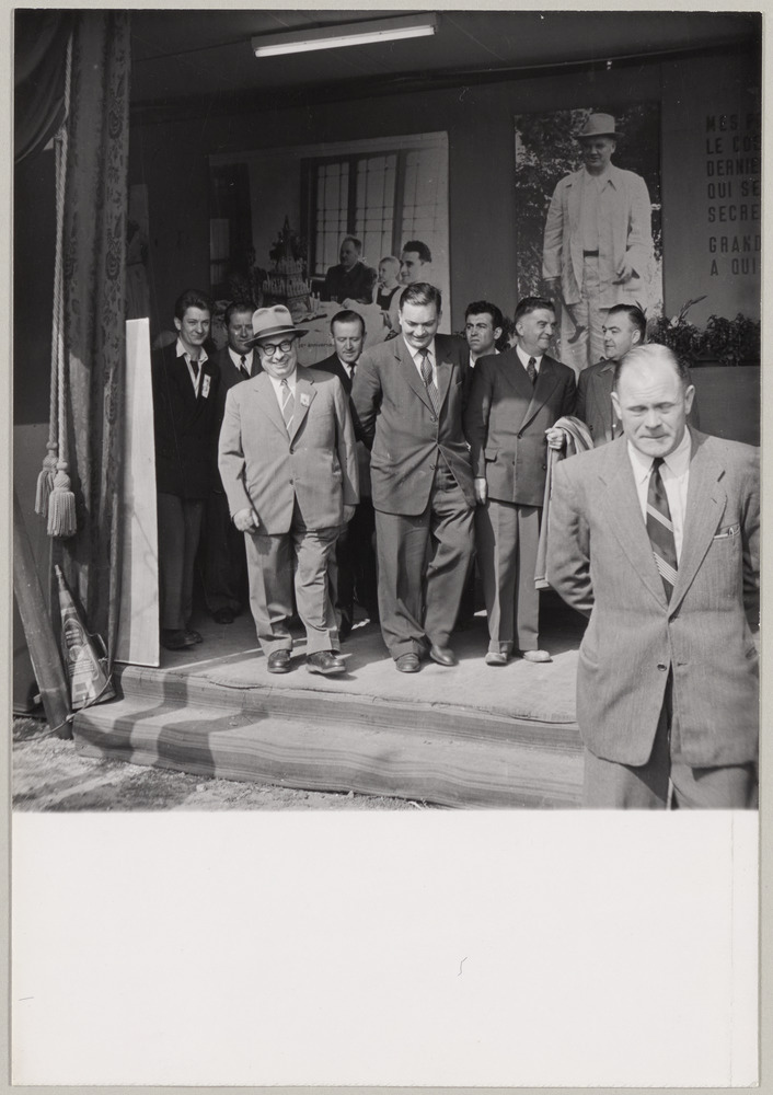 Jacques Duclos et des représentants du Parti communiste français sortant du pavillon d'exposition à l'effigie de Maurice Thorez à la Fête de l'Humanité, Bois de Vincennes, le 7 septembre 1952