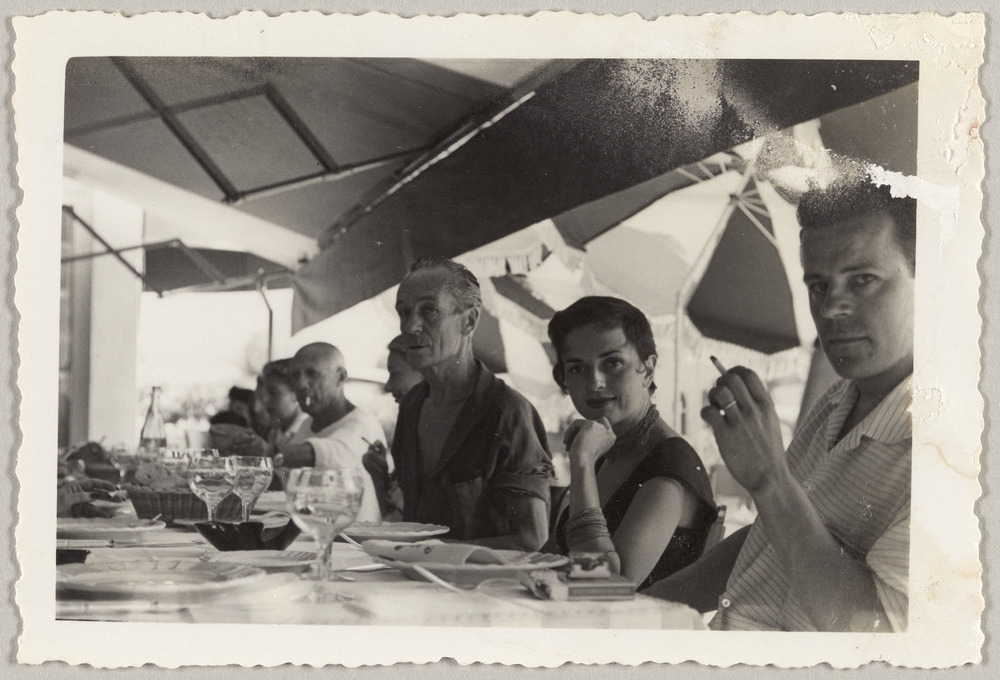 Jacques-Henri Lartigue et sa femme Florette à la table de Pablo Picasso au restaurant, Vallauris, en août 1955