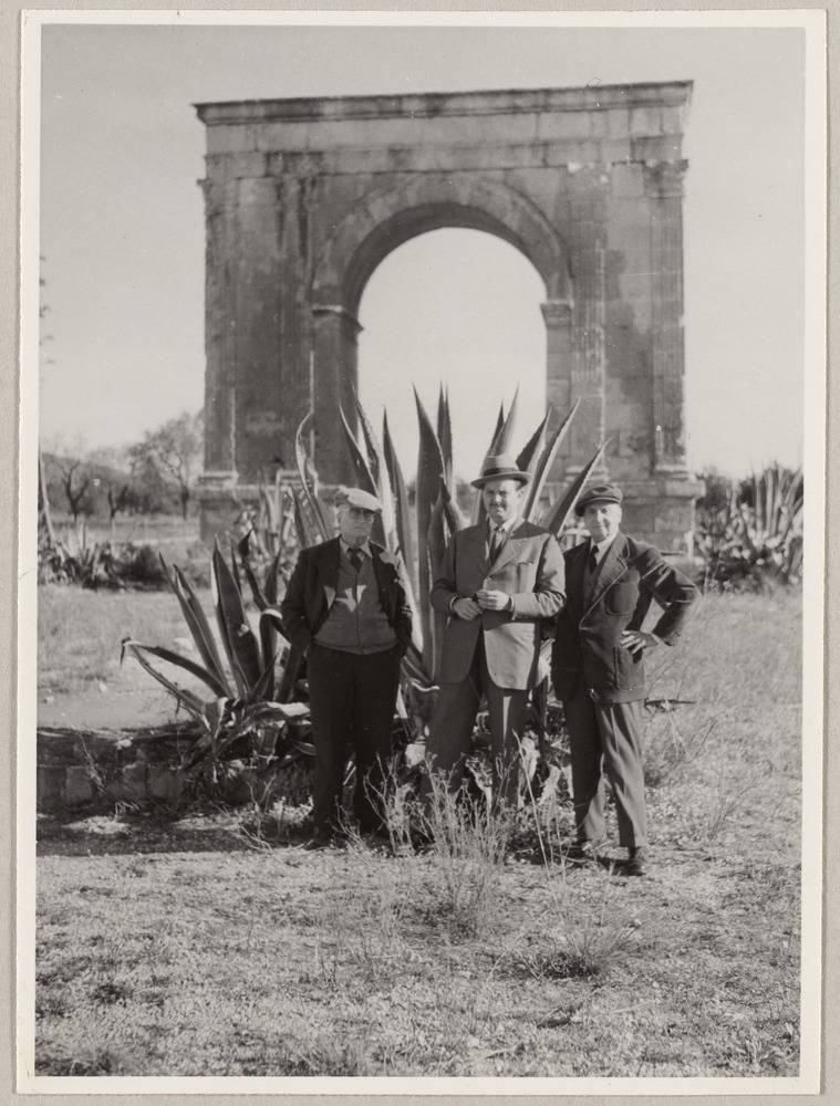 Jaime Sabartés, Joan Gaspar et Joan Vidal Ventosa devant l'arc de Berà près de…